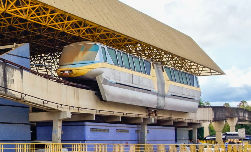 ポソス・デ・カルダス・モノレール Poços de Caldas Monorail1.路線概要ポソス・デ・カルダス・モノレールは、ブラジル・ミナスジェライス州ポソス・デ・カルダス市に建設された高架式モノレール路線である。市内のバスターミナルと中心市街地を結ぶ都市交通として計画され、民間企業によるコンセッション方式で建設された。 計画の法的根拠となったのは、1981年8月20日にポソス・デ・カルダス市議会が承認し、市長ロナウド・ジュンケイラ(Ronaldo Junqueira)が裁可した市法第3119号である。この法律により、高架方式による都市大量輸送システムの建設および運営について、50年間のコンセッション(期限2031年)が認められた。 同法では、建設に必要な土地について市が行政地役権の設定や収用を行うことが可能とされ、さらに建設期間中はコンセッション事業者および施工業者に対して市税の免除が認められていた。 このコンセッションのもと、民間企業 J. Ferreira Ltda. が設計・建設・運営を担当することとなった。当初計画では総延長約30 kmのモノレールネットワークが構想されていたが、実際に建設された区間は大幅に短縮され、約6 km程度にとどまった。 工事は長期化したものの、1991年頃から試験運転が行われ、2000年に正式開業した。しかし開業直後の試運転段階でカーブ区間において脱線事故が発生し、その後本格営業には至らなかった。 さらに2003年には支柱2本が崩落し、約50 mの軌道構造が破壊される事故が発生した。これにより路線の一部が失われ、モノレールは未完成のまま現在まで運行されていない。 計画から30年以上が経過した現在、このモノレールは市の象徴的な未完のインフラとして知られている。市中心部には車両が長年留置されたままとなっており、都市景観への影響も指摘されている。 政治的にもたびたび議論の対象となっており、2002年には市議会議員パウロ・セザール・シルヴァ(Paulo César Silva)が「計画を完成させるか、あるいは撤去するべきだ」と主張したことで注目を集めた。同氏はその後2009年に市長となったが、モノレールの扱いについては「設備の所有者が存在する以上、市が一方的に措置を取ることはできない」と述べている。 なお法律上は、コンセッション期限である2031年にモノレール施設は市の財産に編入されることになっており、その際には「使用可能で良好な状態で引き渡されること」が規定されている。 2.路線データ