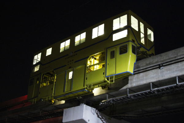 ![]() 写真 工作車501(北九州モノレール 企救丘車両基地) 時刻は0時40分。 営業車両が続々と車庫に入庫する傍らで、工作車達が動きだします。 この夜作業に従事したのは工作車501および201。 |