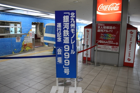 | 小倉駅に配された「銀河鉄道999号」運行記念会場 1番線ホームを使用し式典が催されました。 式典前には、報道向けに車両の内部が公開されました。 |