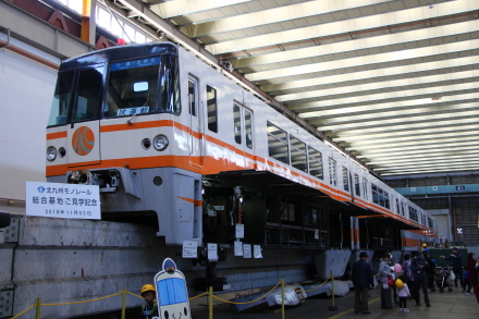 見学会場は会場(車両基地)の最も奥手に位置しています。普段見ることができない検修庫での作業を見る事ができるという事で、例年多くの人で賑わいます。
