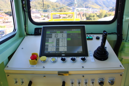 時間になり、工作車が動き出しました。今年の工作車試乗会は、昨年と同じく台車場〜外周を駆け上り分岐器手前までのコース。分岐手前付近ではGLの低さと相まって、なかなかの高度に達します。快晴という事もありとても眺めが良いです。また室内では、社員さんが工作車に関して親切に説明して下さいます。