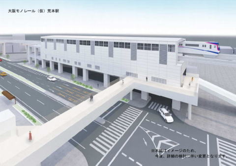 1-1.都市計画事業認可 大坂モノレール瓜生堂延伸整備は、大阪モノレールが都市モノレールで整備される事から都市計画の決定が必要事項となるが、大阪府は都市計画事業認可を国土交通省へ申請、2020年3月27日付けで国土交通省近畿地方整備局長より認可された。 1-2.工事施行認可(軌道法) 同工事施行認可についても、モノレールの運行主体である大阪高速鉄道株式会社が2019年7月22日付で国土交通大臣に申請。こちらも同2020年4月1日付けで認可されている。 【事業概要】 1.建設区間 門真市駅から(仮称)瓜生堂駅まで 2.路線延長 約8.9キロメートル 3.駅数 4駅 門真南駅、鴻池新田駅、荒本駅、瓜生堂駅(いずれも仮称) 4.開業目標 2029年(令和11年) 5.事業主体 ・大阪府(支柱、桁及び駅舎などのインフラ部) ・大阪高速鉄道株式会社(電気・通信施設などのインフラ外部) 6.概算事業費 約1,050億円(税込) ・インフラ部 約740億円・インフラ外部 約310億円 2.延伸ルート概要(2020年度版) 本項では、2018年度に公表された都市計画変更の素案ならびに大阪府が公表した各駅のイメージパースをベースとしつつ、現在決定がなされている都市計画図に則り延伸ルート上の要所をトピックスとして紹介する。なお、紹介する順序は既存終点駅となる門真市駅より(北→南)方向に紹介する。 2-1.「(仮称)門真市駅」 瓜生堂までの延伸時は現在未使用となっている上下線を本線として新たに運用する。なお、中央に位置する軌道は上下線の入れ替え線として機能するもの。大阪モノレールの軌道桁が存在するのは現状この門真市駅先の軌道末端部までとなっており、2029年度目標に進められる大坂モノレール瓜生堂延伸整備において延長が成される。 まず軌道法により敷設される都市モノレールにおいてはずせないのが、通称「都市計画道路」と呼ばれる計画道路およびその計画案。今回瓜生堂までの延伸が決定した大阪モノレールも、事業認可ならびに工事施行認可の内容に則り整備が進められる。大阪モノレール瓜生堂までの延伸区間のうち、モノレール専用道が帰属する都市計画道路およびモノレール専用道の名称は以下の通りとなる。 幹線街路3・1・223-1大阪中央環状線 223-2都市高速鉄道大阪モノレール 延長5080m(1320m) 特殊街路9・7・223-1大阪モノレール専用道 延長5080m 223-5都市高速鉄道大阪モノレール 延長5040m 特殊街路9・7・227-1大阪モノレール専用道 延長5040m まず、瓜生堂までの延伸ルートのほぼ全線において帰属する事となるのが「幹線街路3・1・223-1大阪中央環状線」で、通称府道2号中央環状線と称される (以下、中央環状線と略記)。近畿自動車道や一部区間において大阪モノレールと併走、箇所によっては道路全体の幅員が120mを越える、文字通り大阪の大動脈として知られる。