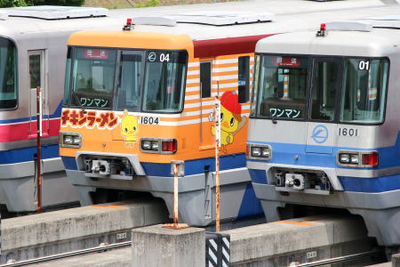 ![]() 2011年3月に運行を開始した大阪モノレールチキンラーメン号。 広告主は、ラッピング名でもお馴染み「チキンラーメン」等を商品展開する日清食品ホールディングス株式会社。 ラッピングデザインは、「チキンラーメン」のパッケージをイメージし、 車両全面および側面には、愛嬌たっぷりのマスコットキャラクター、「ひよこちゃん」が配置されています。 運行:2011年3月1日〜 |