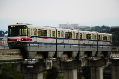2.大阪モノレールの車両2-1.1000形,2000形大阪モノレール第一期区間の開業(千里中央~南茨木)では、日立製作所製の1000形車両が導入されました。大阪モノレールの軌道桁を初めて跨いだのは、昭和62年1月9日に搬入された試作車両(06編成)でした。 この試作車両のテスト結果をベースとして、平成元年9月から11月にかけてさらに量産車両5編成(01~05編成)が完成、車両基地に搬入されました。 編成はMc1-M2-M1-Mc2の全電動車とし、4両固定編成2両1ユニットとされています。 現在の所、1101、1102を1ユニット、1105、1106を1ユニットとして計2ユニット(4両編成)で運用されています。 大阪モノレールでは将来6両編成化が施される計画で、これに備えて中間ユニット増設用として1103および1104が欠番となっています。 将来の6両編成化のための構造は連結部にも現れており、1101および1102、1105および1106間が固定用の棒連結器を採用しているのに対し、両ユニット間では密着自動連結器が採用されています。 なお、編成両先頭車両(1101および1106)では簡易首振り装置付き密着連結器が採用されています。 車体構造は全アルミニウム合金製の溶接構造で、薄肉大型材および中空材の導入による構造の簡略化および軽量化が図られています。 また、日本跨座式を基本としており、室内の床面は全面平面床構造かつ座席のロングシート配置とする事で輸送力の増大が図られています。 台車構造は2軸ボギーボルスターレス電動台車で、台車枠は鋼板溶接組立となっています。 初期に採用された主電動機は界磁チョッパ制御式でしたが、以後導入車両の2000形ではVVVF化されています。