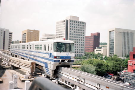 6-2.日本跨座式モノレール1967年代、日本国内での渋滞問題は悪化する一方で、より優れた輸送手段としてモノレールが研究対象となりました。時の運輸省(現在の国土交通省)は、日本モノレール協会に委託する形で「都市交通に適したモノレールの開発研究」を取りまとめます。 その結果、日本版ともいえるアルウェーグ(ALWEG)式モノレール、日本跨座式モノレールが誕生する事になりました。 日本跨座式はアルウェーグ(ALWEG)式をベースとしながらも軌道桁を太く取り、2軸ボギー台車を採用しました。 国内導入時のアルウェーグ(ALWEG)式(犬山遊園線や東京モノレール等)に対し、走行倫直径を小さく、幅を広く持たせ床面高さを高くすることで、室内へのタイヤハウスの突き出しを無くしました。 その代償として、重心が高くなってしまった日本跨座式モノレールは、曲線通過速度が遅くなってしまう事、トンネル建設の際のコストが大きくなってしまう事等、デメリットも発生しました。 日本跨座式のデビューは日本万国博覧会(大阪万博)で、大阪万博会場内の移動路線として導入、環状運転されました。 その後、1985年には日本跨座式初の営業路線として、北九州高速鉄道小倉線へ導入されます。 以後日本国内ではアルウェーグ(ALWEG)式の跨座式を採用して開業した路線はすべてこの日本跨座式を採用しています。