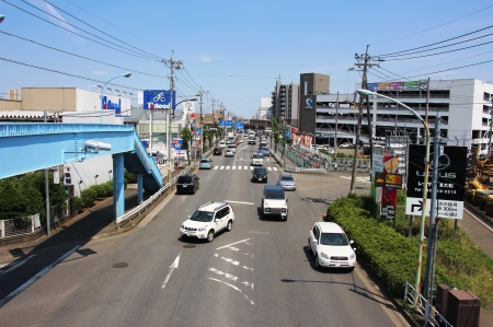 | [写真6 駐輪場を歩道橋上より撮影(写真中央より右手付近)] さらに駐輪所脇を新青梅街道箱根ヶ崎方向へ進むと、新青梅街道上下線を横断出来る「立野歩道橋」が設置されています。駐輪場位置を箱根ヶ崎方向より撮影するため、「立野歩道橋」上に上りました。写真6に示す写真が、先ほど脇を通過した「駐輪場」。 [写真7 駐輪場を歩道橋下部より撮影(写真中央付近)] 「立野歩道橋」を渡り反対車線へ移動、歩道橋下部より先ほどと同様に「駐輪場」位置を撮影します。 分かり辛い写真を掲載してしまいましたが、今テーマで着目している駐輪場は、単純な長方形ではなく長方形と台形を組み合わせた異型を有しています。 この駐輪所こそが、最後のテーマのサブタイトルとさせていただきました「新青梅街道の将来幅員を示す証」。この「駐輪場」の正体とは、将来計画のために用地取得された空地の有効利用の結果です。図2に【駐輪場周辺の都市計画(拡幅前後の新青梅街道と駐輪場の位置関係)】を示しました。 ![]() 図2 駐輪場周辺の都市計画 (拡幅前後の新青梅街道と駐輪場の位置関係) 図中黄色で示す実線および点線が現在の新青梅街道の幅員、オレンジ色で示す実線および点線が将来の新青梅街道の幅員、すなわち計画幅員です。 図から分かる通り、この「駐輪場」は将来の計画幅員内に位置しています。新青梅街道は、2016年にモノレール箱根ヶ崎延伸計画ルート上全区間において認可が下りましたが、2020年代初めにはこのオレンジ色で示す区域まで道路幅が拡幅される事となります。 |