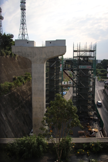 小丘を下り始めると直ぐ(写真正面奥)に、建設中のモノレール支柱が姿を現します。