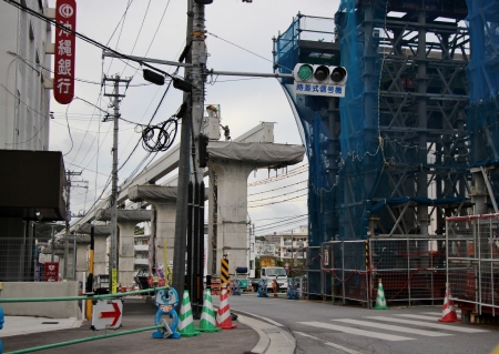 | 石嶺駅へと続くモノレール軌道桁 写真に写っている区画、半年前は軌道桁は設置されていませんでした。 (右写真参考) 交差点区間に採用される鋼軌道桁はいずれも合成合理桁となっています。 |
