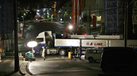 | 時刻は深夜0時を過ぎました。 支柱部への設置のため、鋼軌道桁がクレーン車によって吊り上げられていきます。 |