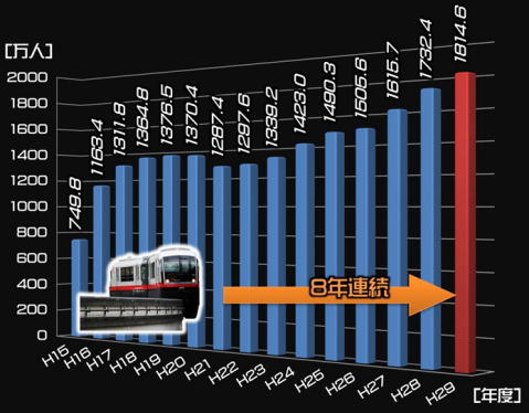 ![]() 沖縄都市モノレール線(ゆいレール)乗客数の推移(年度別) |