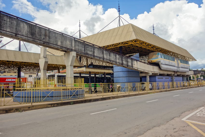ポソス・デ・カルダス・モノレール Poços de Caldas Monorail1.路線概要ポソス・デ・カルダス・モノレールは、ブラジル・ミナスジェライス州ポソス・デ・カルダス市に建設された高架式モノレール路線である。市内のバスターミナルと中心市街地を結ぶ都市交通として計画され、民間企業によるコンセッション方式で建設された。 計画の法的根拠となったのは、1981年8月20日にポソス・デ・カルダス市議会が承認し、市長ロナウド・ジュンケイラ(Ronaldo Junqueira)が裁可した市法第3119号である。この法律により、高架方式による都市大量輸送システムの建設および運営について、50年間のコンセッション(期限2031年)が認められた。 同法では、建設に必要な土地について市が行政地役権の設定や収用を行うことが可能とされ、さらに建設期間中はコンセッション事業者および施工業者に対して市税の免除が認められていた。 このコンセッションのもと、民間企業 J. Ferreira Ltda. が設計・建設・運営を担当することとなった。当初計画では総延長約30 kmのモノレールネットワークが構想されていたが、実際に建設された区間は大幅に短縮され、約6 km程度にとどまった。 工事は長期化したものの、1991年頃から試験運転が行われ、2000年に正式開業した。しかし開業直後の試運転段階でカーブ区間において脱線事故が発生し、その後本格営業には至らなかった。 さらに2003年には支柱2本が崩落し、約50 mの軌道構造が破壊される事故が発生した。これにより路線の一部が失われ、モノレールは未完成のまま現在まで運行されていない。 計画から30年以上が経過した現在、このモノレールは市の象徴的な未完のインフラとして知られている。市中心部には車両が長年留置されたままとなっており、都市景観への影響も指摘されている。 政治的にもたびたび議論の対象となっており、2002年には市議会議員パウロ・セザール・シルヴァ(Paulo César Silva)が「計画を完成させるか、あるいは撤去するべきだ」と主張したことで注目を集めた。同氏はその後2009年に市長となったが、モノレールの扱いについては「設備の所有者が存在する以上、市が一方的に措置を取ることはできない」と述べている。 なお法律上は、コンセッション期限である2031年にモノレール施設は市の財産に編入されることになっており、その際には「使用可能で良好な状態で引き渡されること」が規定されている。 2.路線データ