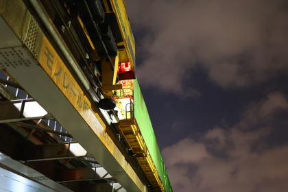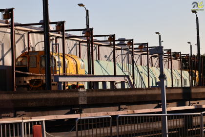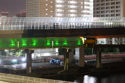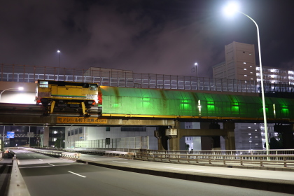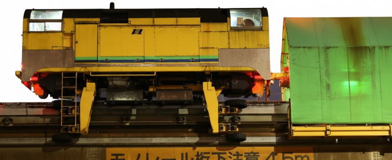 特にDE牽引工作車の重要な役割は、架線作業貨車の輸送にあります。モノレールの電力設備保守では、高所に設置された架線や関連機器に対する点検・更新作業が必要となりますが、その際には専用の作業貨車を所定位置まで搬送する牽引車が不可欠です。DE牽引工作車は、こうした作業編成の先頭に立って運用されることが多く、夜間の限られた作業時間の中で、効率的かつ確実に保守作業を実施するための基盤となっています。